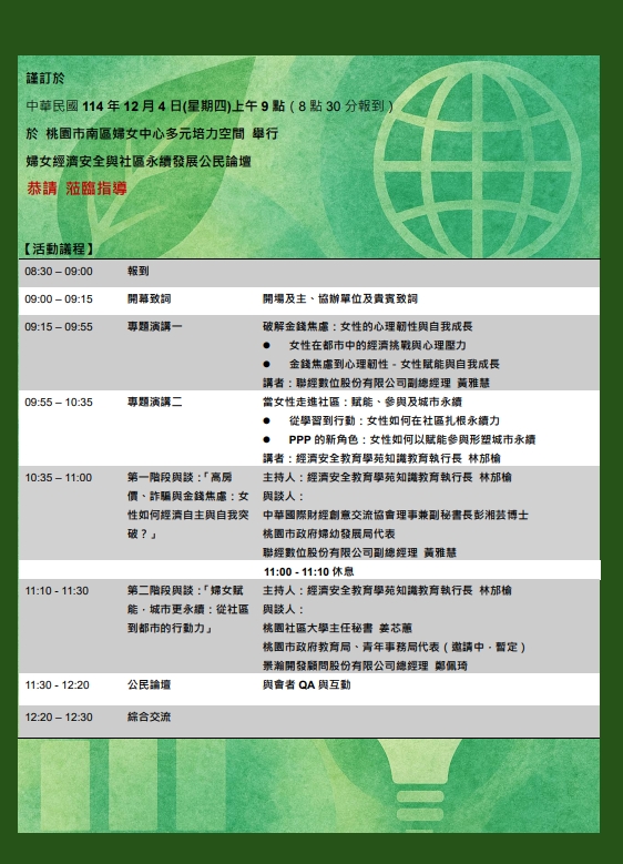 【公民論壇免費參加】【婦女經濟安全與社區永續發展】🔥請盡速報名🔥